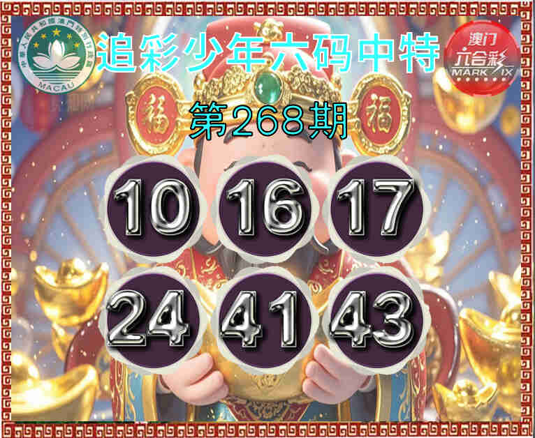 268期:【追彩少年】 ⛩️六码中特⛩️【10.16.17.24.41.43】开:10