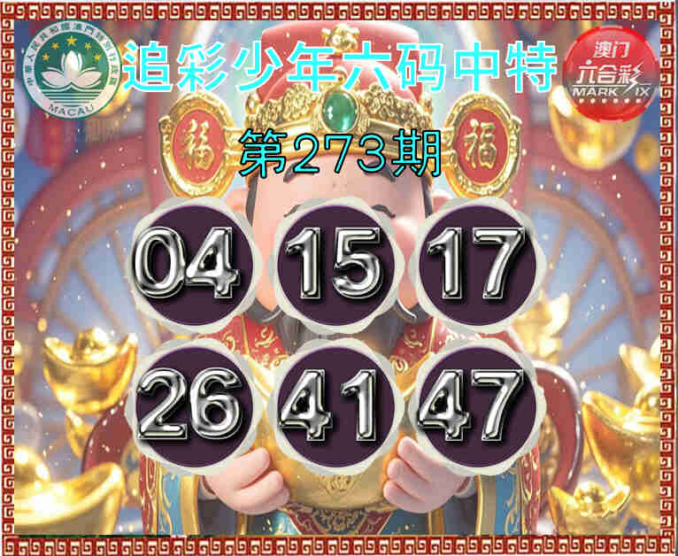 273期:【追彩少年】 ⛩️六码中特⛩️【04.15.17.26.41.47】开:04