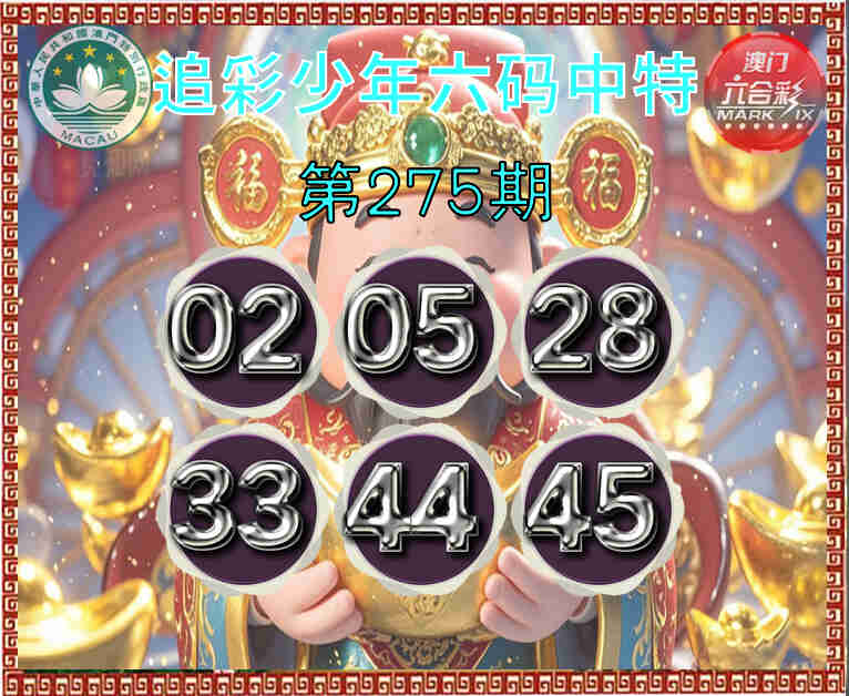 275期:【追彩少年】 ⛩️六码中特⛩️【02.05.28.33.44.45】开:45