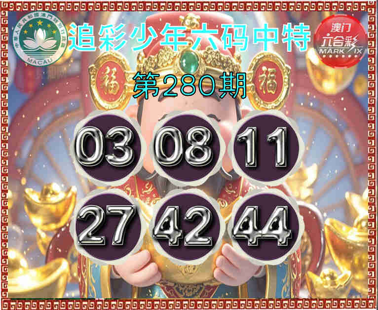 280期:【追彩少年】 ⛩️六码中特⛩️【03.08.11.27.42.44】开:42